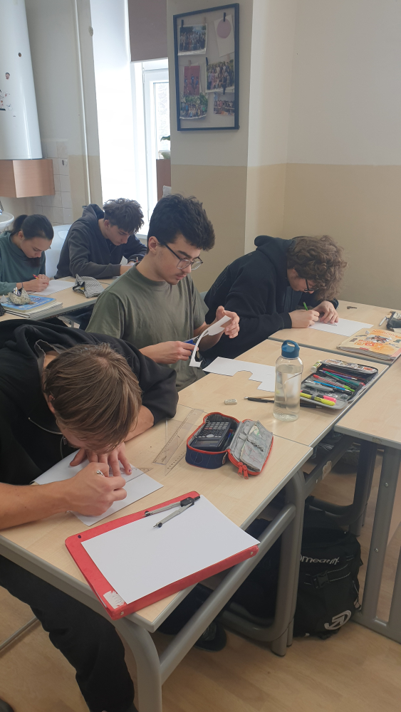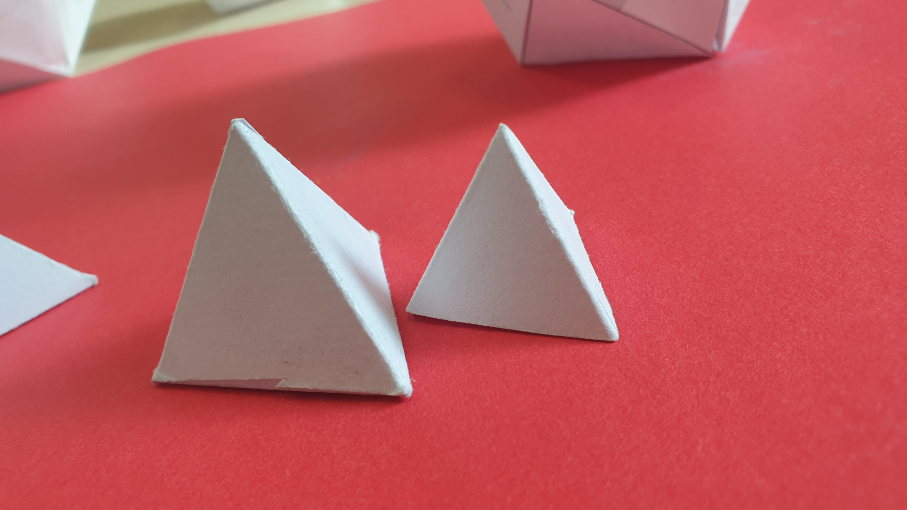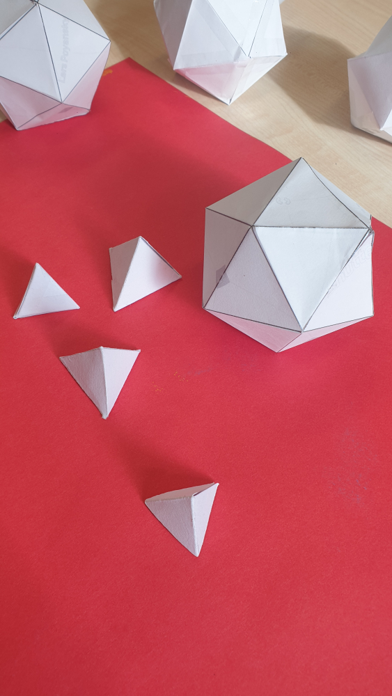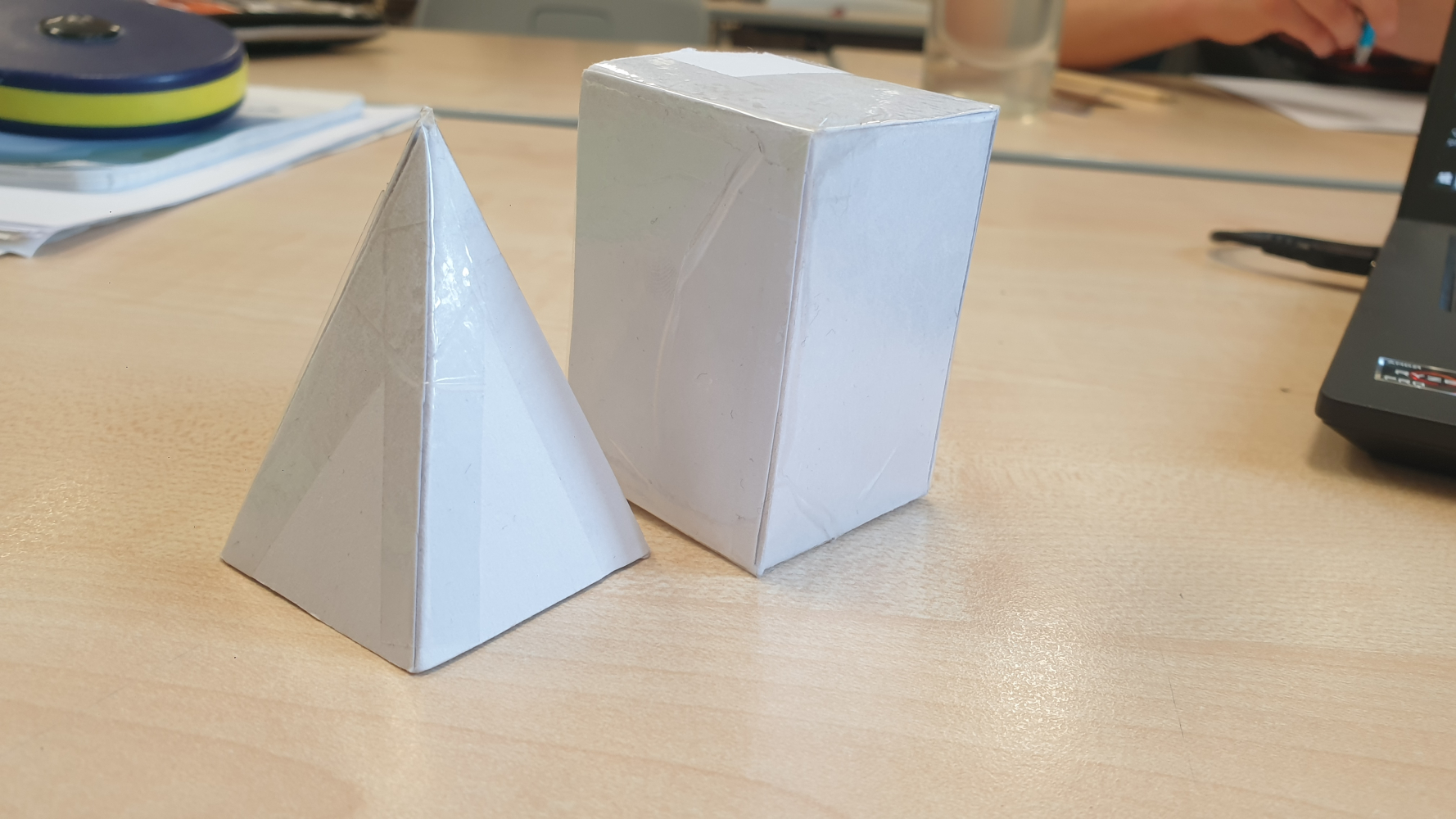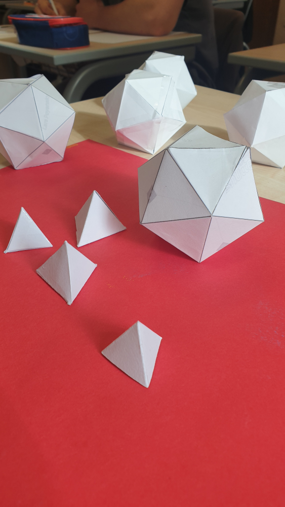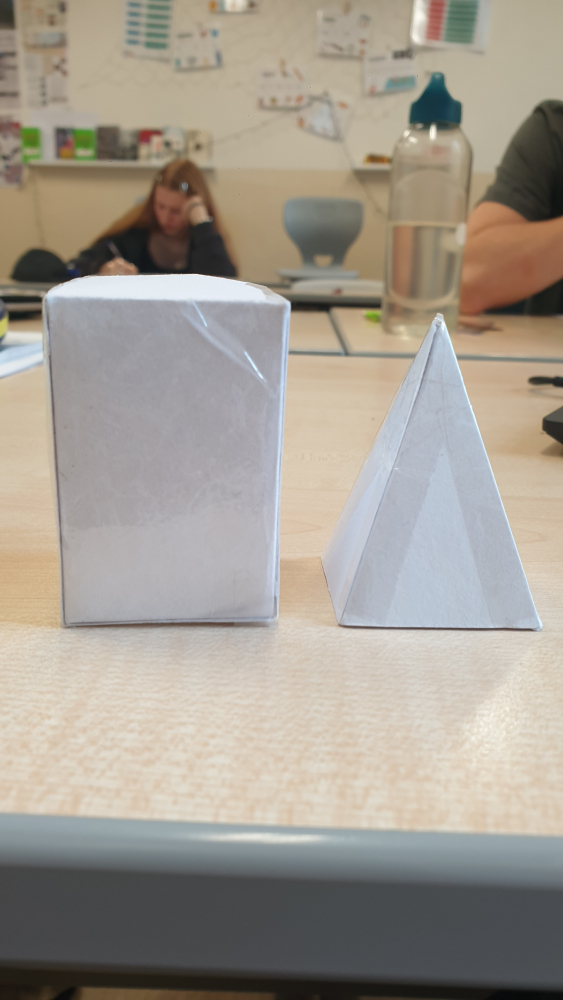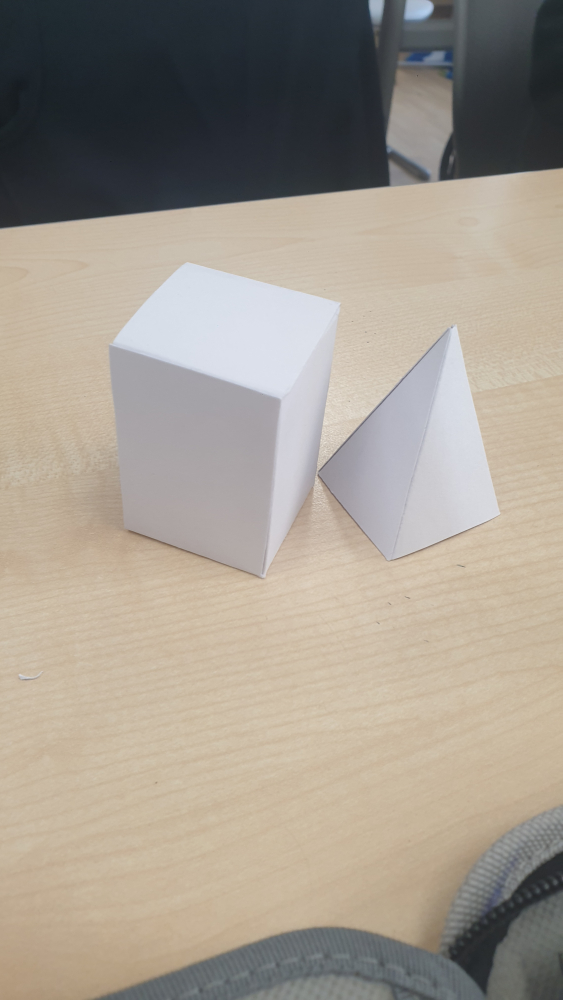 Minulý týden jsme s deváťáky začali probírat JEHLAN. Na úvod jsme si řekli pár slov o Platónských tělesech a některá jsme si dokonce v rámci výzvy složili z papíru. V dalším dni jsme se snažili odvodit vzorec pro výpočet objemu jehlanu pomocí kvádru.