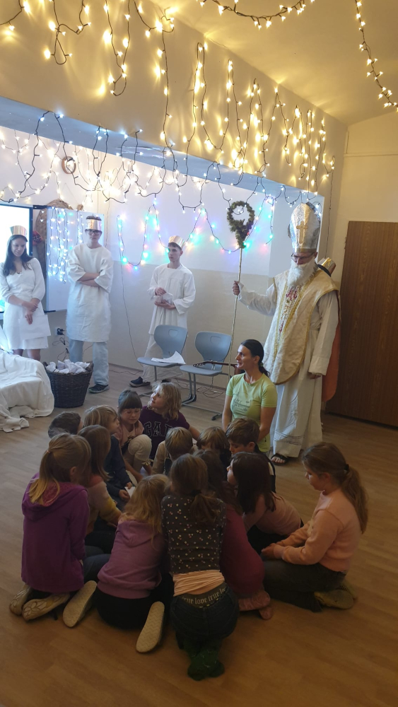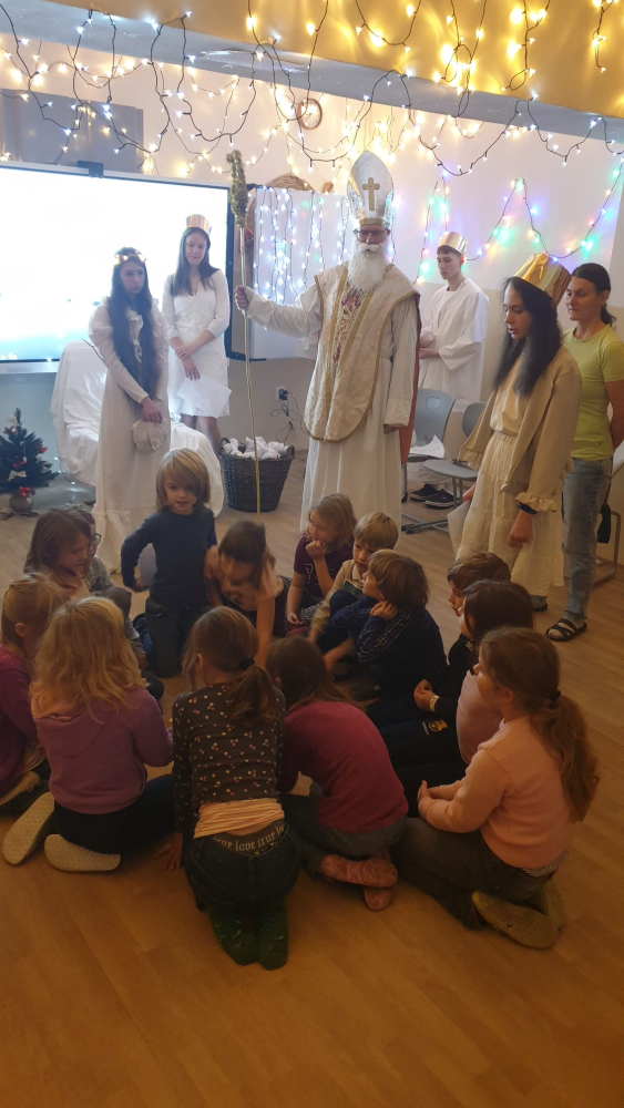 Velkým překvapením byla tentokrát pozvánka od svatého Mikuláše, který spolu s anděly přivítal všechny děti na nebesích. Děkujeme jim za milé pozvání, krásný pěvecký výkon a dobrůtky, které si pro nás připravili.