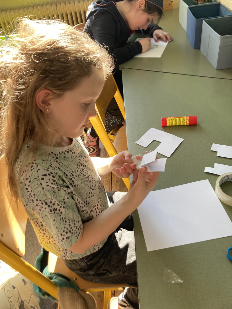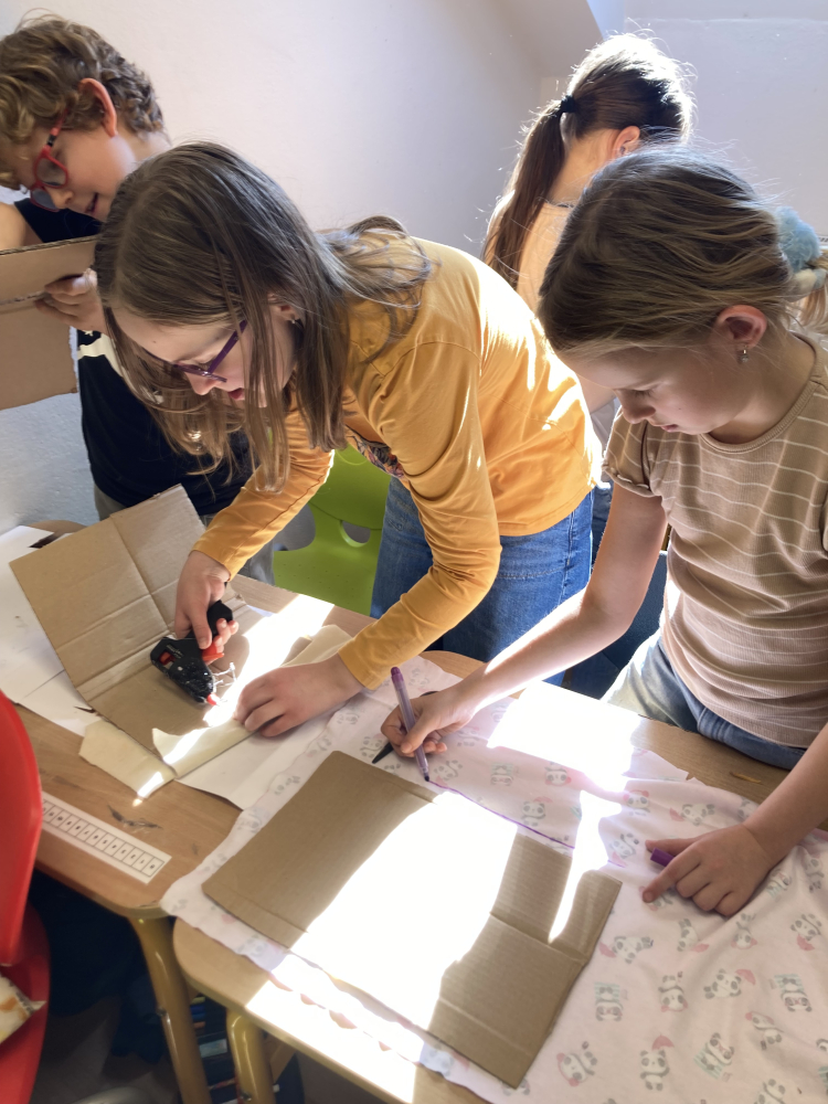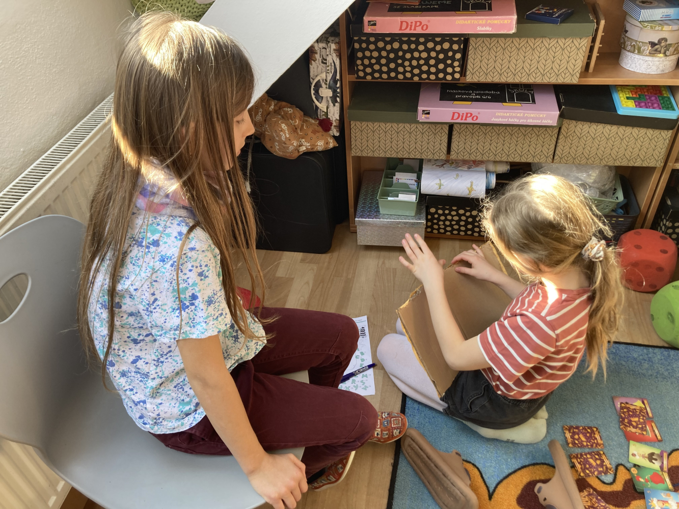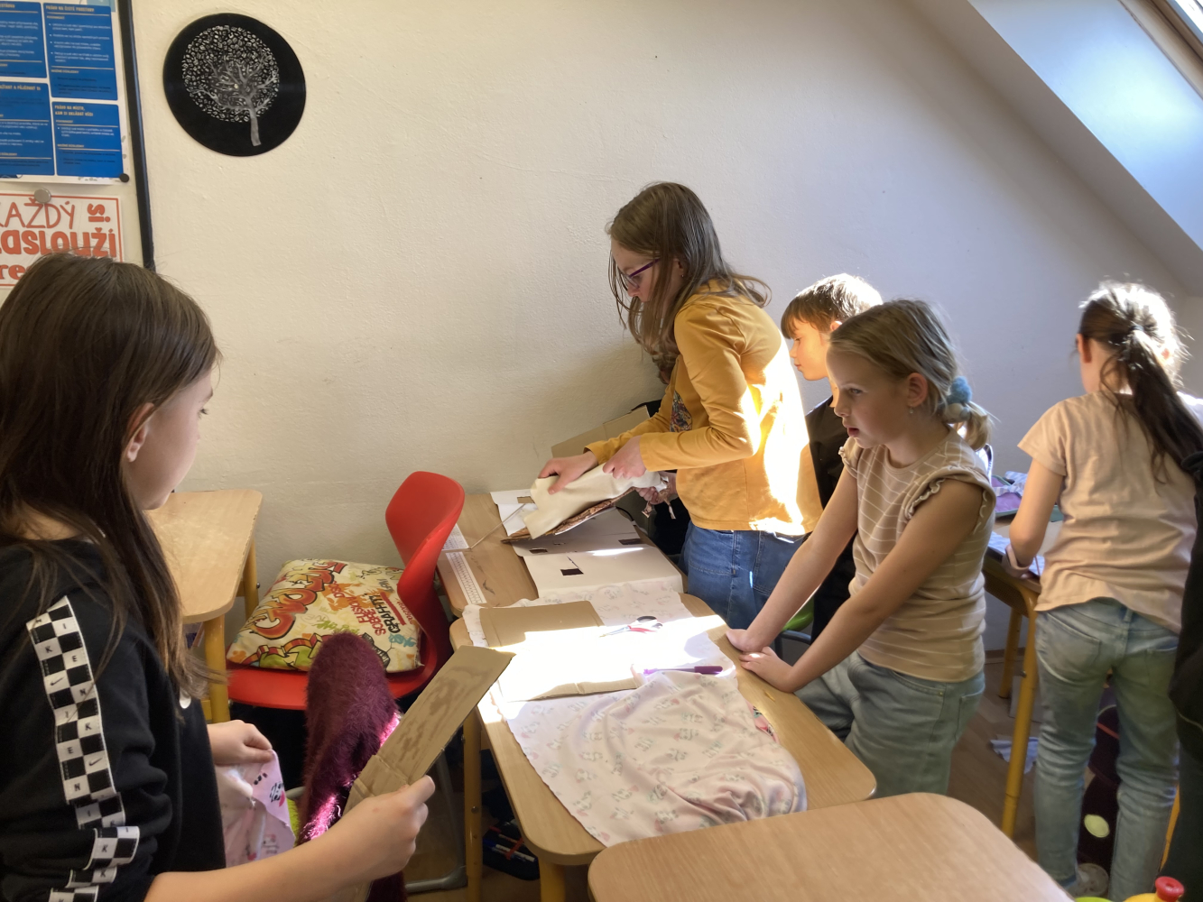 V hodinách výtvarné výchovy a pracovních činností jsme někteří využili družinkové stavebnice a také jsme si vyrobili látkou polepené desky na sešit či budoucí knihu.