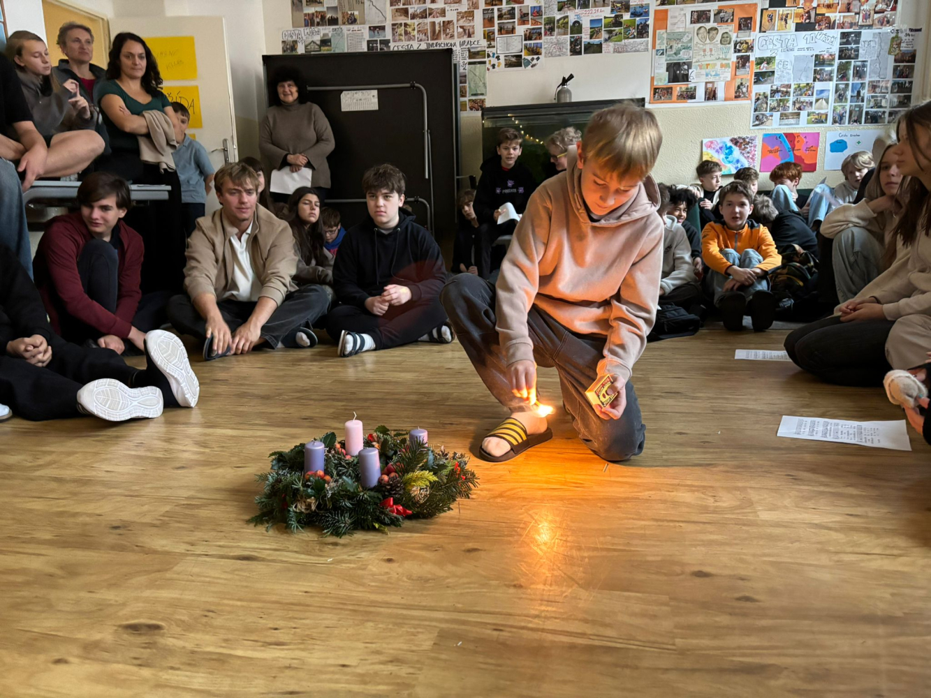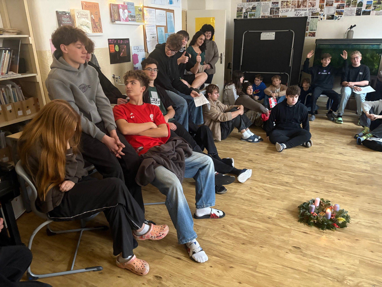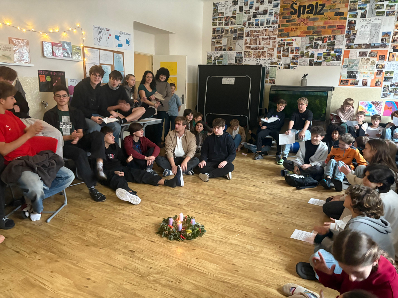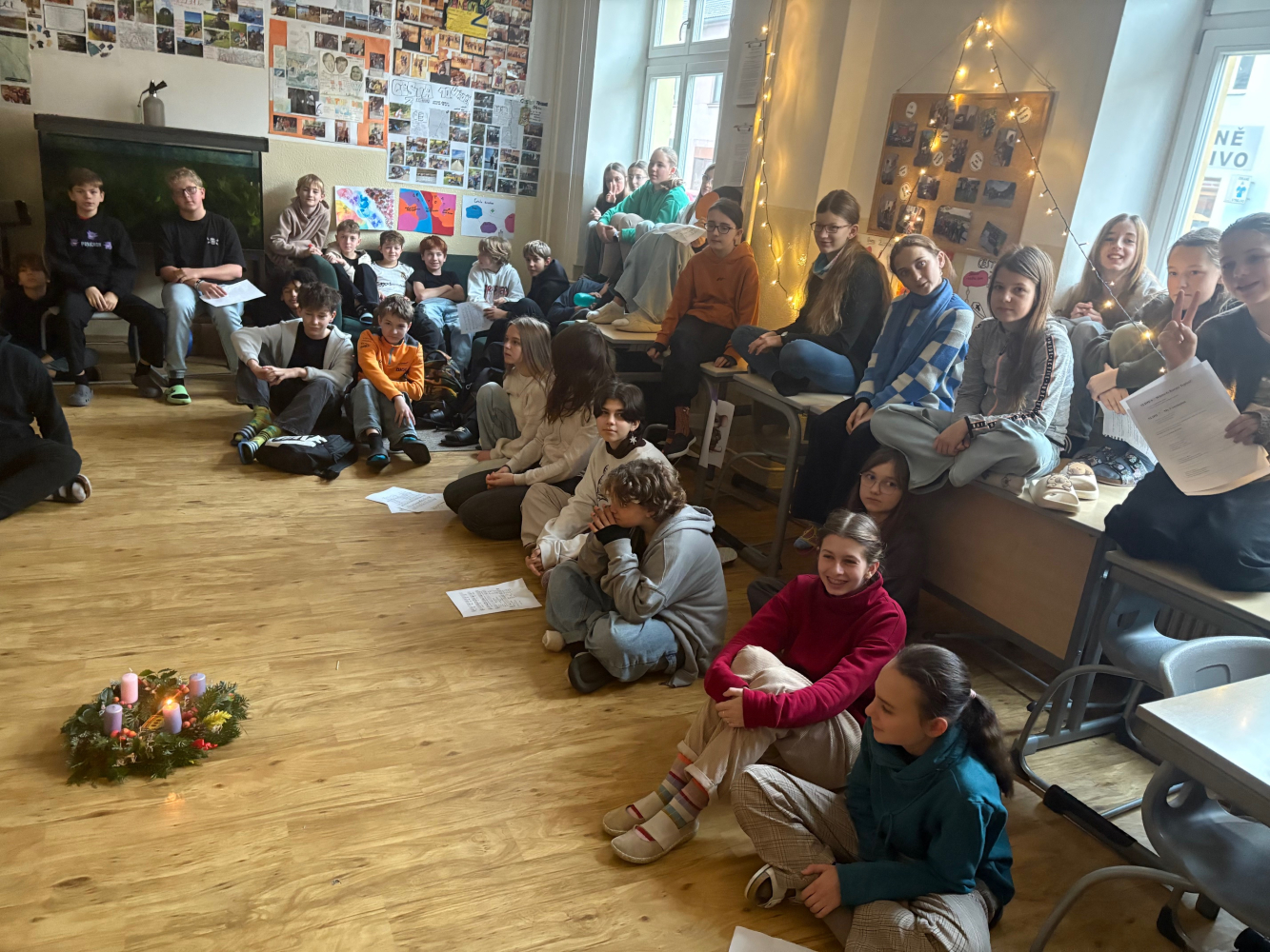 Z organizačních důvodů jsme již dnes na druhém stupni zahájili adventní čas. Po úvodní společné písničce jsme si povídali o adventu. Co znamená, kdy se slaví, s čím je spojen, ale i třeba proč máme na adventním věnci tři fialové a jednu růžovou svíčku. První svíčku nám zapálil Darek, jeden z žáků, kteří se k nám připojili v tomto školním roce.