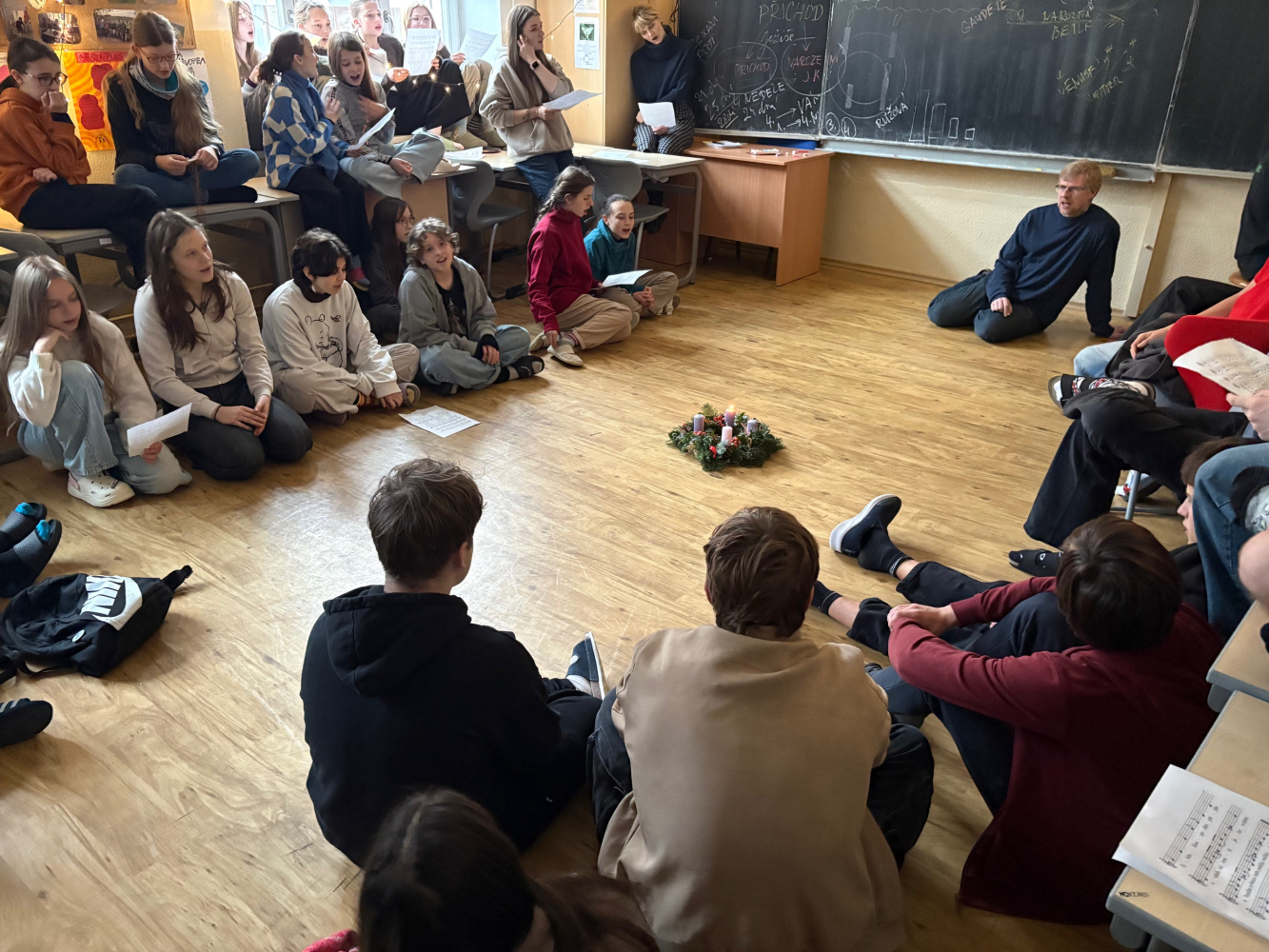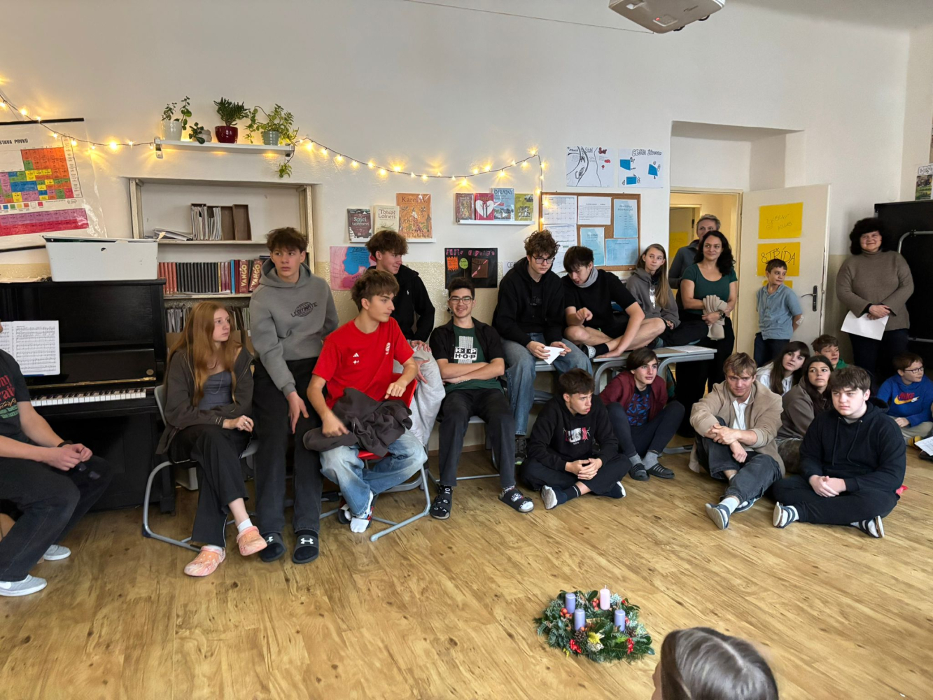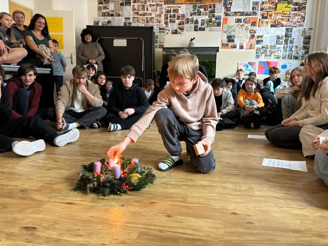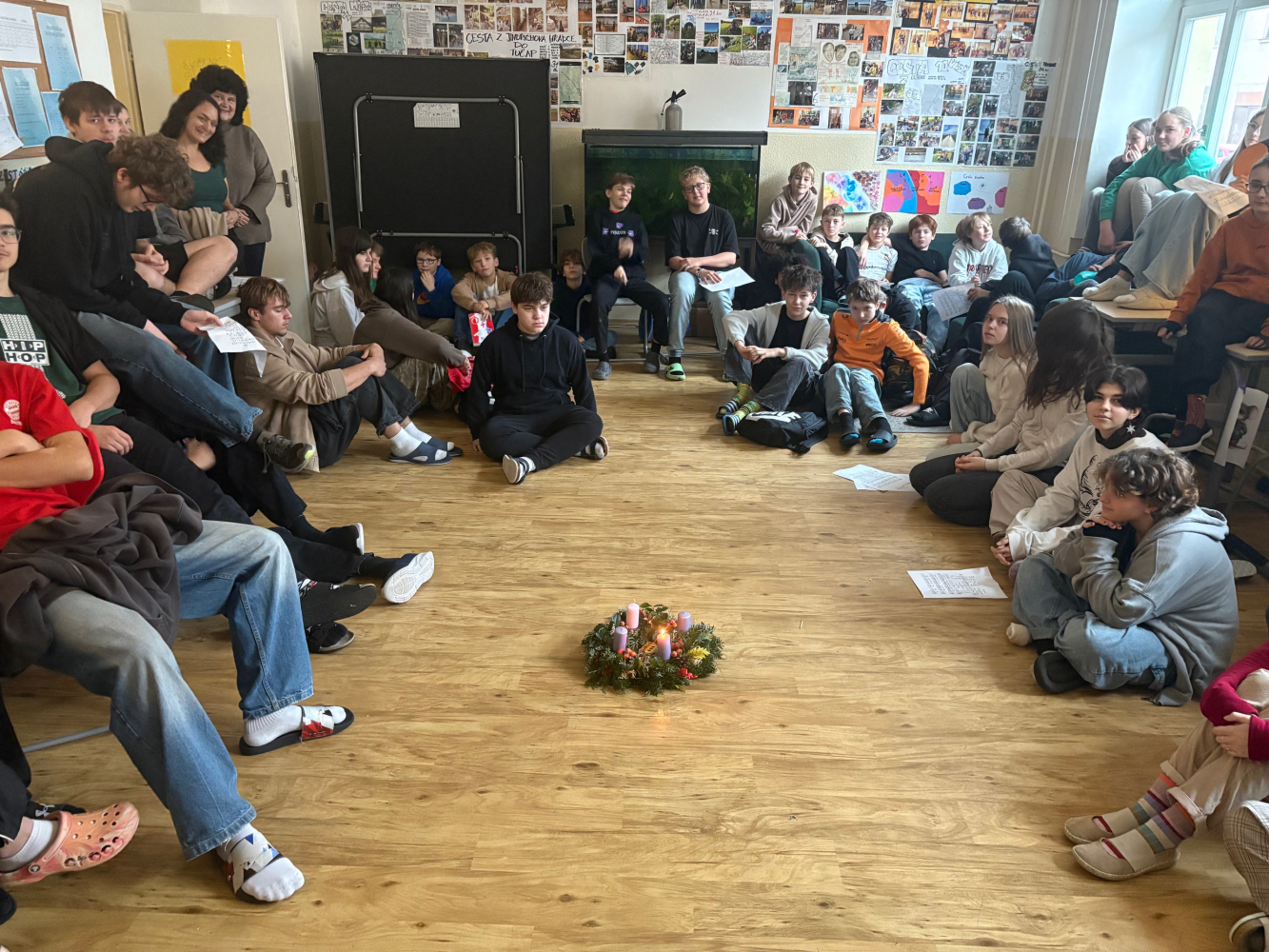 Z organizačních důvodů jsme již dnes na druhém stupni zahájili adventní čas. Po úvodní společné písničce jsme si povídali o adventu. Co znamená, kdy se slaví, s čím je spojen, ale i třeba proč máme na adventním věnci tři fialové a jednu růžovou svíčku. První svíčku nám zapálil Darek, jeden z žáků, kteří se k nám připojili v tomto školním roce.