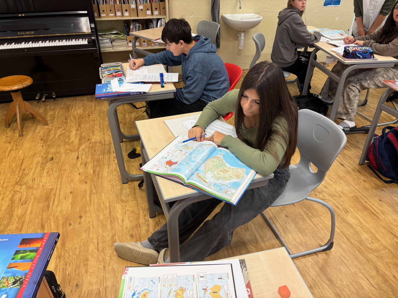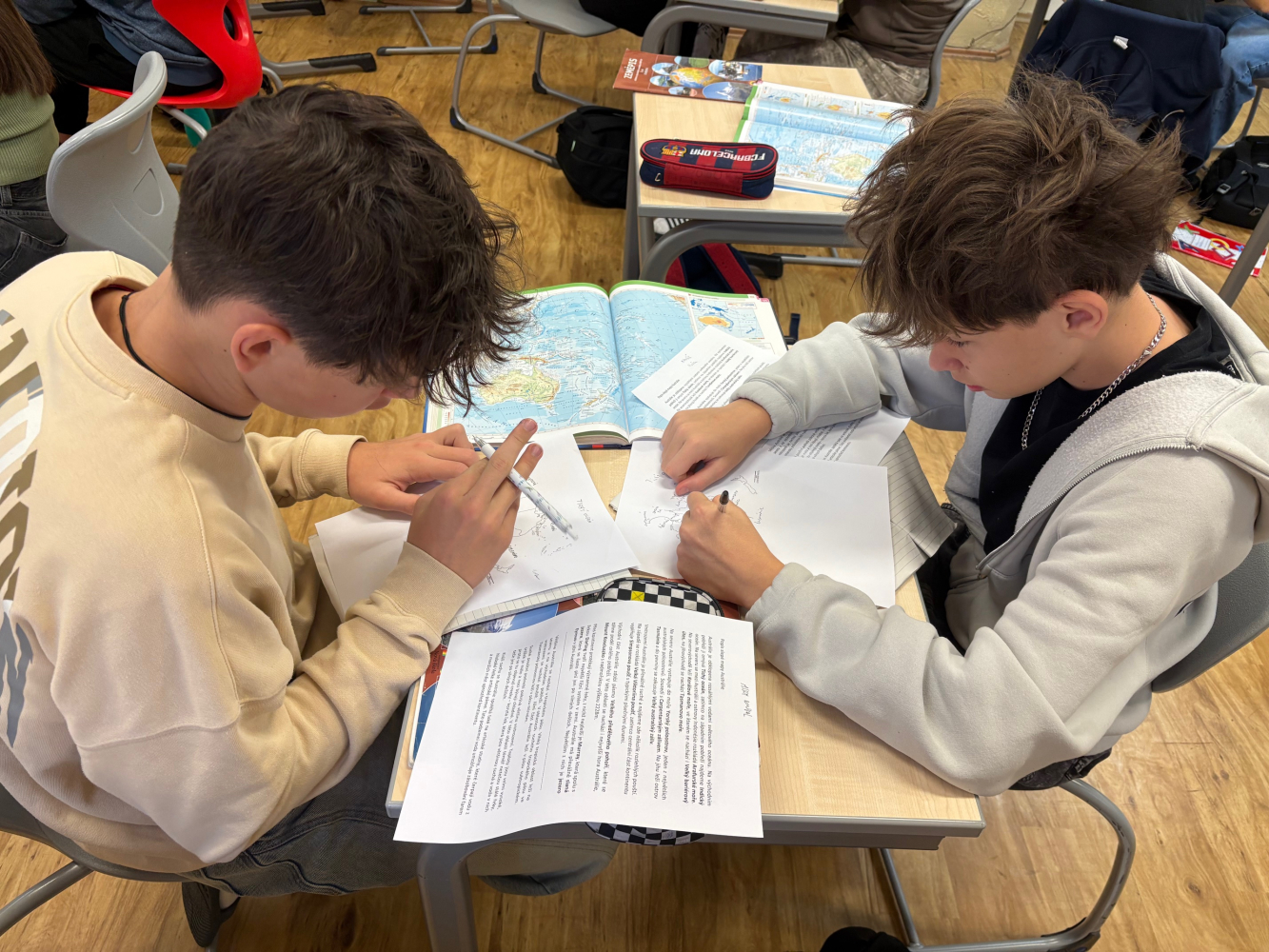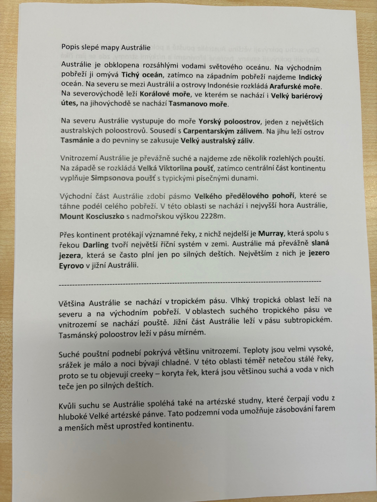 Dnes jsme se vydali do Austrálie. Celou hodinu jsme se samostatně a ve dvojicích učili o Austrálii prostřednictvím odborného textu, atlasu a zaznamenávání do slepé mapy.
